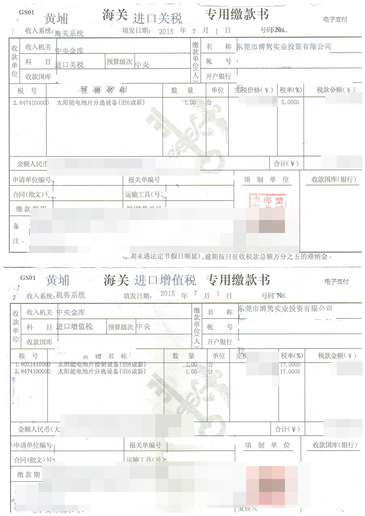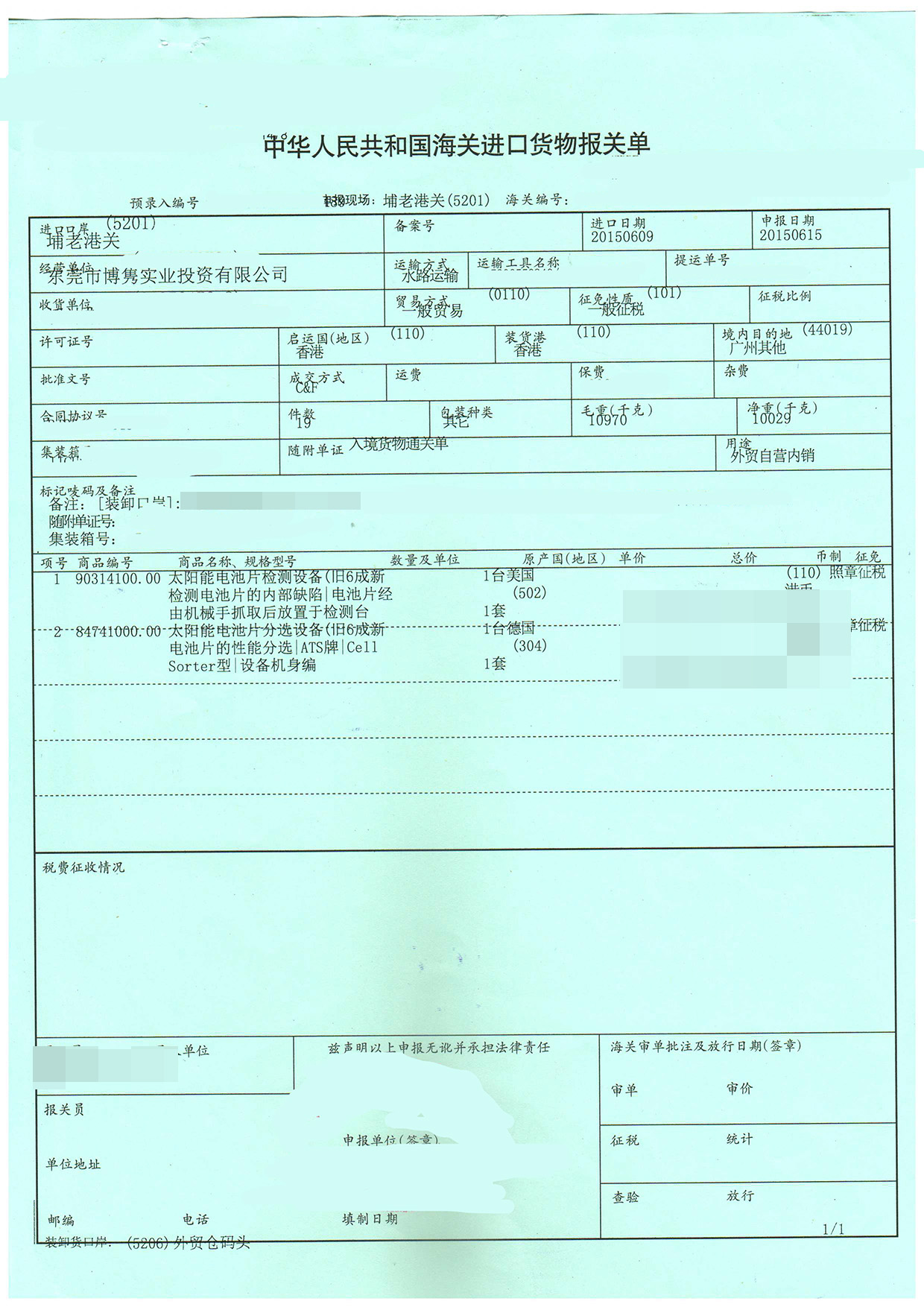 操作貨物:太陽能電池片檢測設(shè)備(舊6成新)、太陽能電池片分選設(shè)備(舊6成新)