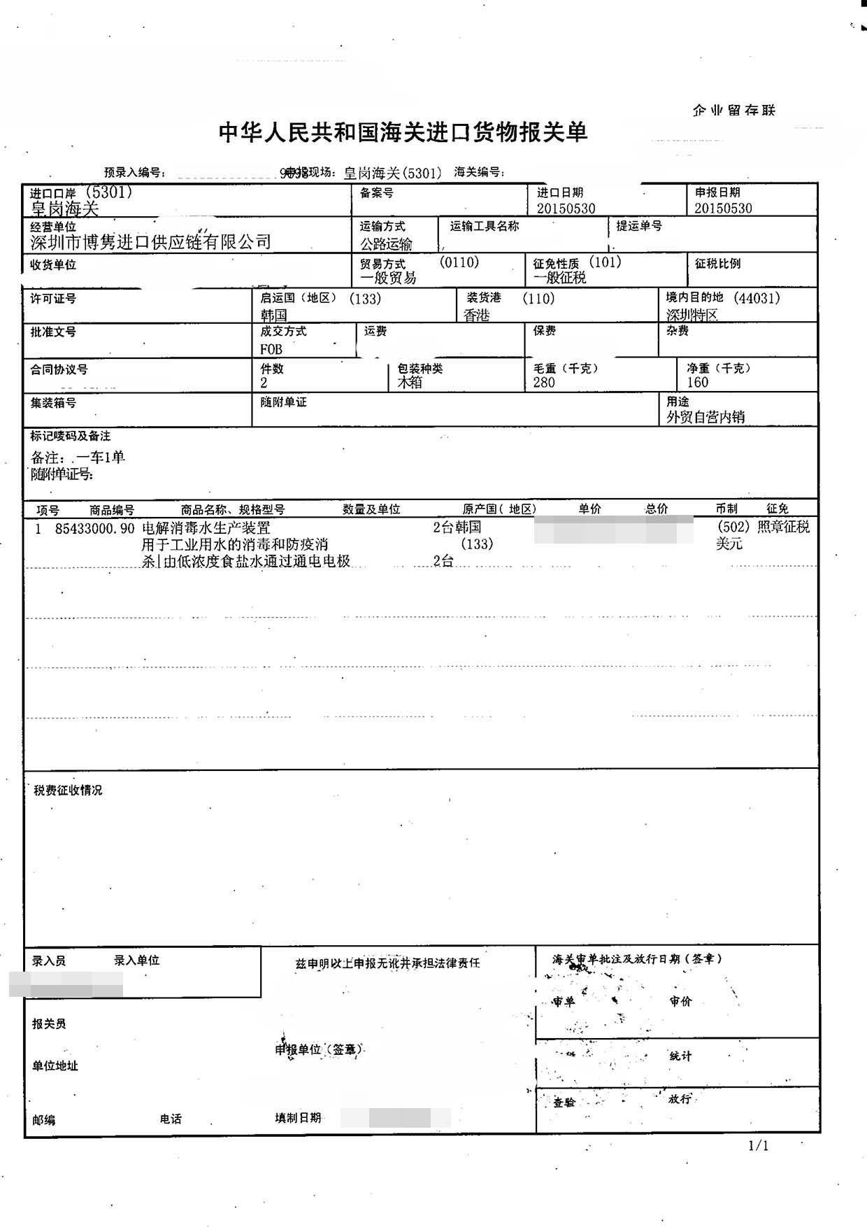 一、電解消毒水生產(chǎn)裝置進(jìn)口報關(guān)手續(xù)