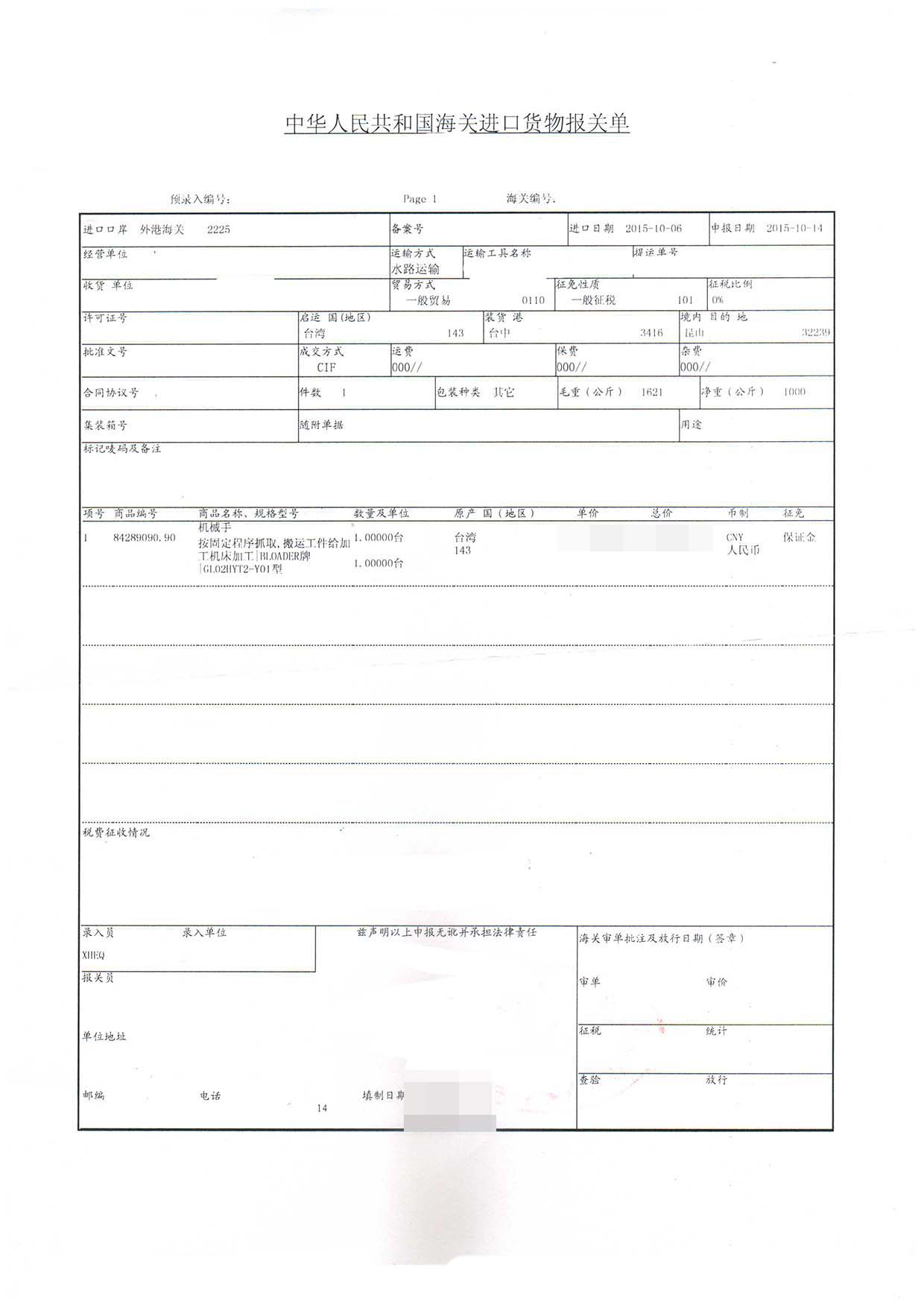 進(jìn)口日期:2015-10-06