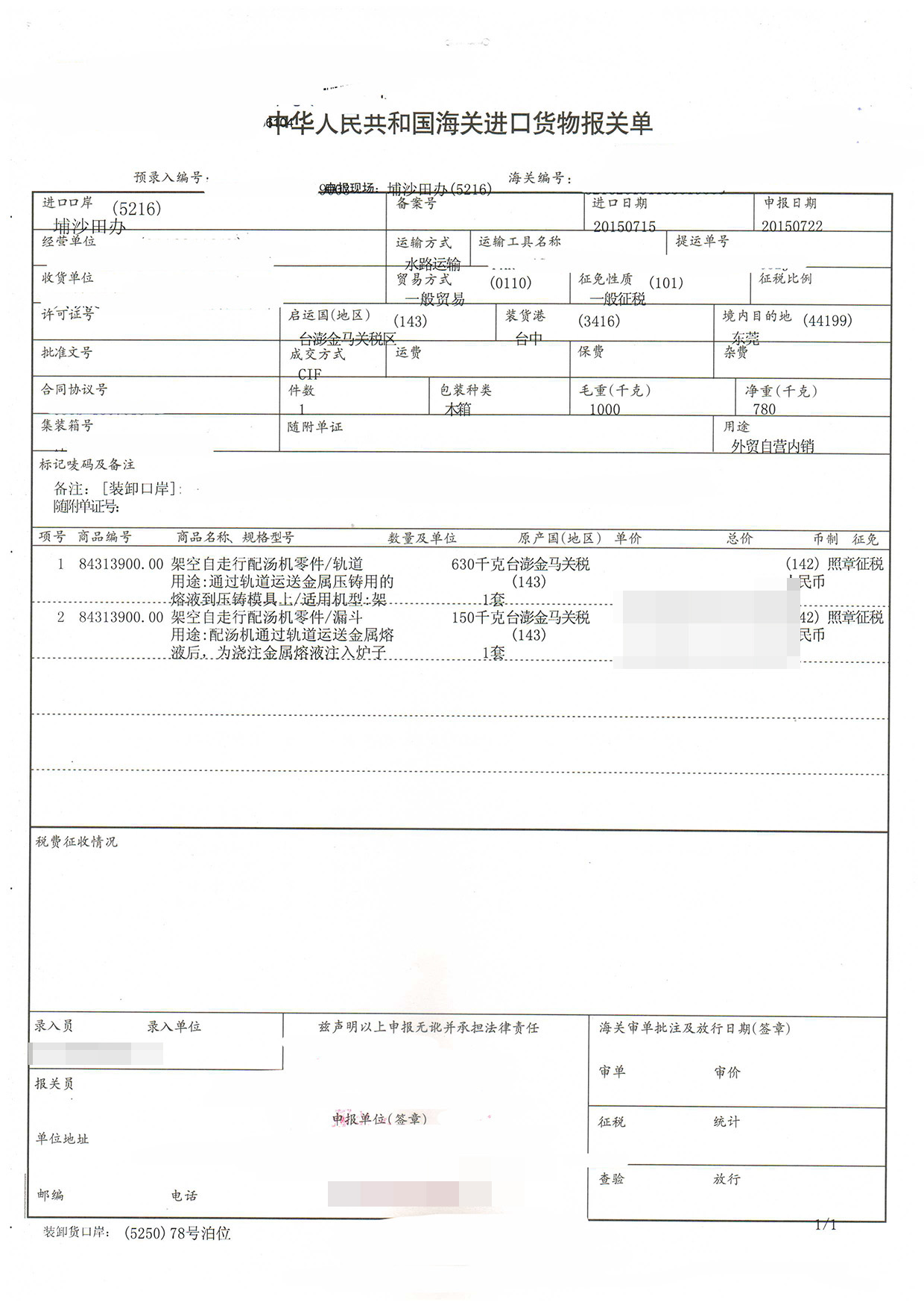 壓鑄給湯機(jī)的功能是通過(guò)機(jī)械連桿原理來(lái)實(shí)現(xiàn)從熔爐取合金湯液按理想的軌跡送至壓鑄機(jī)壓射室的動(dòng)作的機(jī)械設(shè)備。有些壓鑄五連桿給湯機(jī)有滴料功能,能消除鋁液表面的氧化物,有效提高合格率。我司擁有豐富的配湯機(jī)配件進(jìn)口報(bào)關(guān)手續(xù)流程及案例,現(xiàn)在為大家詳細(xì)介紹一下關(guān)于配湯機(jī)配件進(jìn)口報(bào)關(guān)那些事兒!
