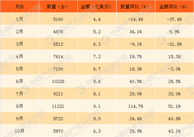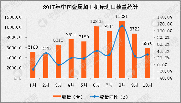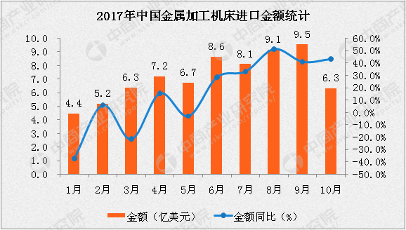 2017年10月中國金屬加工機床進口金額6.3億美元,同比增長43.1%。1-10月,中國金屬加工機床進口金額達71.4億美元,同比增長13.1個百分點。