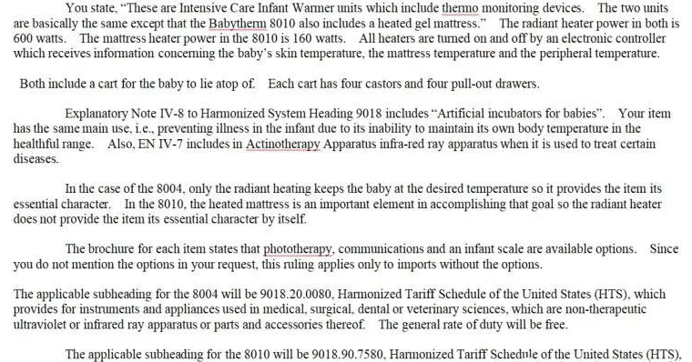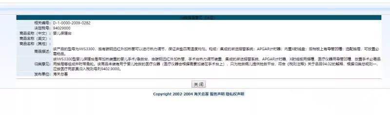 美國(guó)海關(guān)認(rèn)為:嬰兒保溫臺(tái)的主要功能與注釋品目90.18中的“嬰兒人工保溫箱”等醫(yī)療設(shè)備類(lèi)似,目的為了防止嬰兒生病,應(yīng)按醫(yī)療設(shè)備歸入品目90.18。